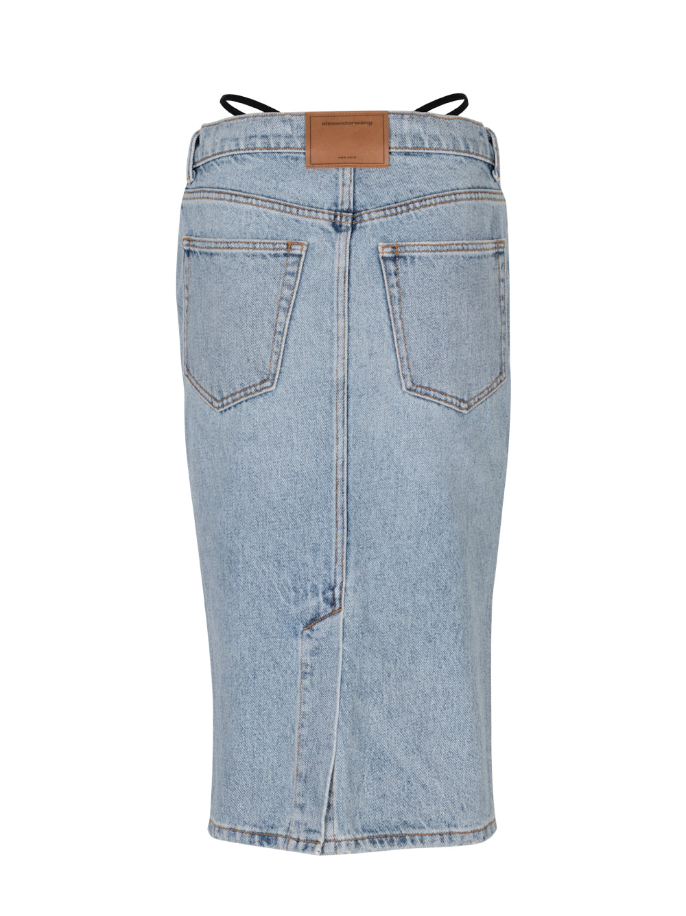 กระโปรงยีนส์ สี Vintage Fade รุ่น Diamanté Thong Midi Skirt In Denim ผลิตจากผ้าคอตตอน สัมผัสนุ่มสบาย ทรงเอ มีกระเป๋าด้านหน้าและด้านหลัง ตกแต่งสายคาดเอว พร้อมโลโก้จากแบรนด์ Alexander Wang