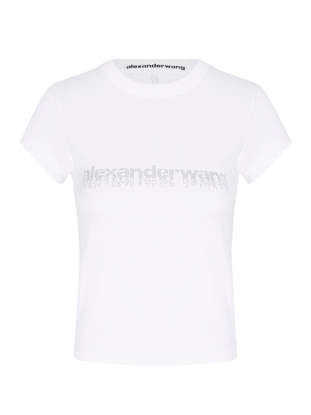 Alexander Wang แบรนด์ของนักออกแบบอัจฉริยะแห่งวงการแฟชั่นชาวอเมริกันที่สร้างชื่อให้ตัวเองในวงการก่อนก่อตั้งแบรนด์ของตัวเองเมื่อปี ค.ศ. 2005 เสื้อยืดแขนสั้นสลิมฟิต ดีไซน์ทรงเข้ารูปแขนสั้นขนาดกระทัดรัด ตกแต่งด้วยคอเสื้อแบบริบและโลโก้ประดับคริสตัลแบบไล่เฉดสีบริเวณอกกลาง เสริมลุคเรียบง่ายแต่โดดเด่นด้วยประกายแวววาวอย่างมีระดับ