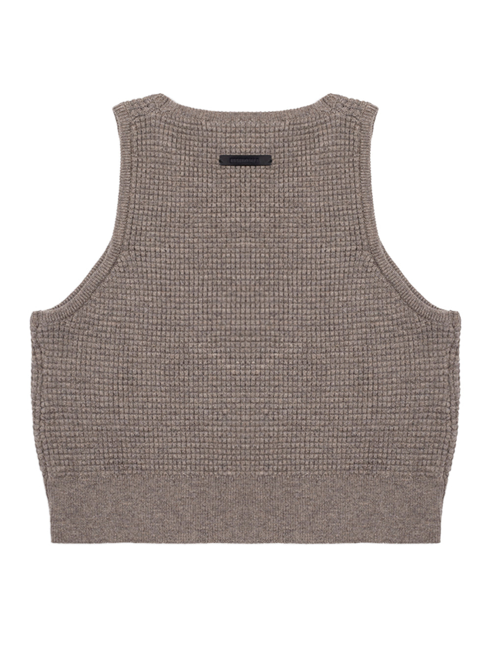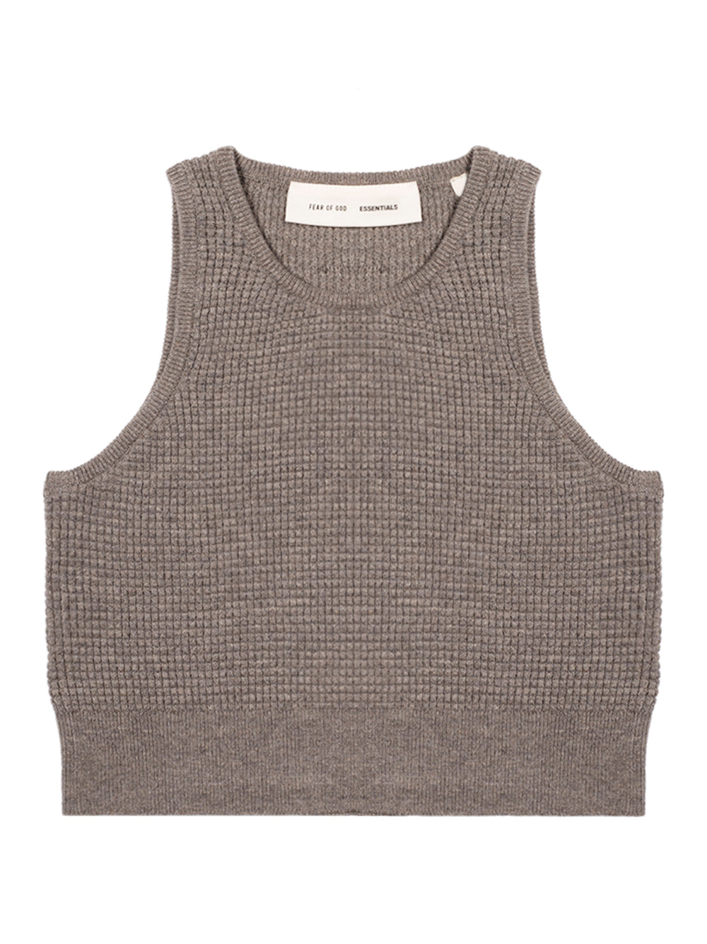 เสื้อครอปแขนกุดจากแบรนด์ FEAR OF GOD ESSENTIALS ผลิตจากผ้าวาฟเฟิลถักผสมโพลีเอสเตอร์และไนลอน ให้ความยืดหยุ่น สวมใส่สบาย พร้อมมิติสัมผัสของเนื้อผ้าที่โดดเด่น ออกแบบมาในทรงเข้ารูปและความยาวแบบครอป เหมาะสำหรับการสวมใส่เดี่ยวหรือเลเยอร์ร่วมกับไอเทมอื่น ตกแต่งด้วยป้าย Fear of God Essentials บริเวณด้านหลังตัวเสื้อ