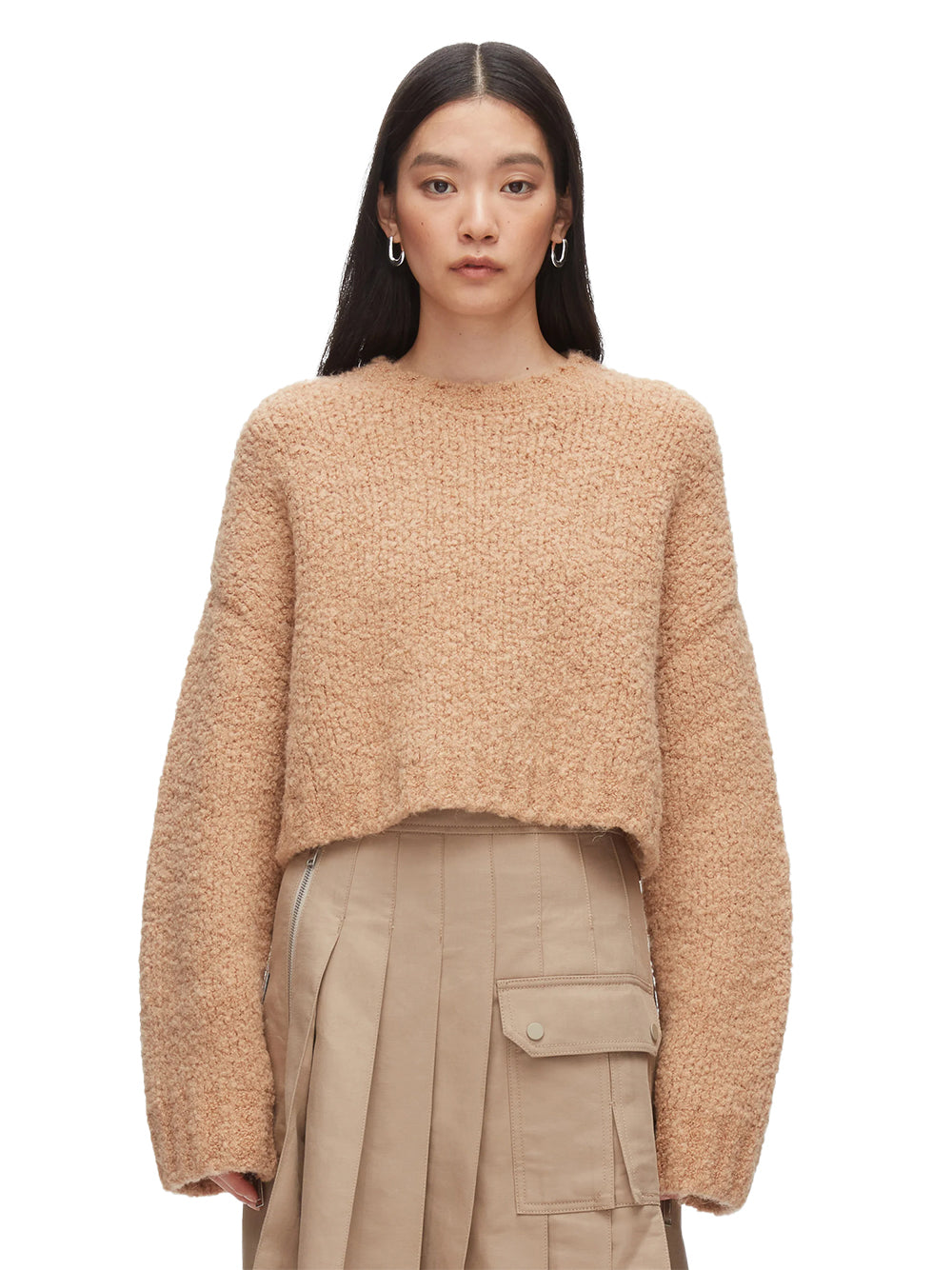 A modern knit with a tactile twist. This cropped sweater is spun from a richly textured wool blend boucle that adds dimension and warmth without bulk. The relaxed silhouette features extra-long sleeves and functional zippers along the sides—wear them closed for a clean shape or slightly open for a layered, deconstructed edge. Cozy and directional, it’s the perfect knit to anchor cool-weather looks with subtle attitude.