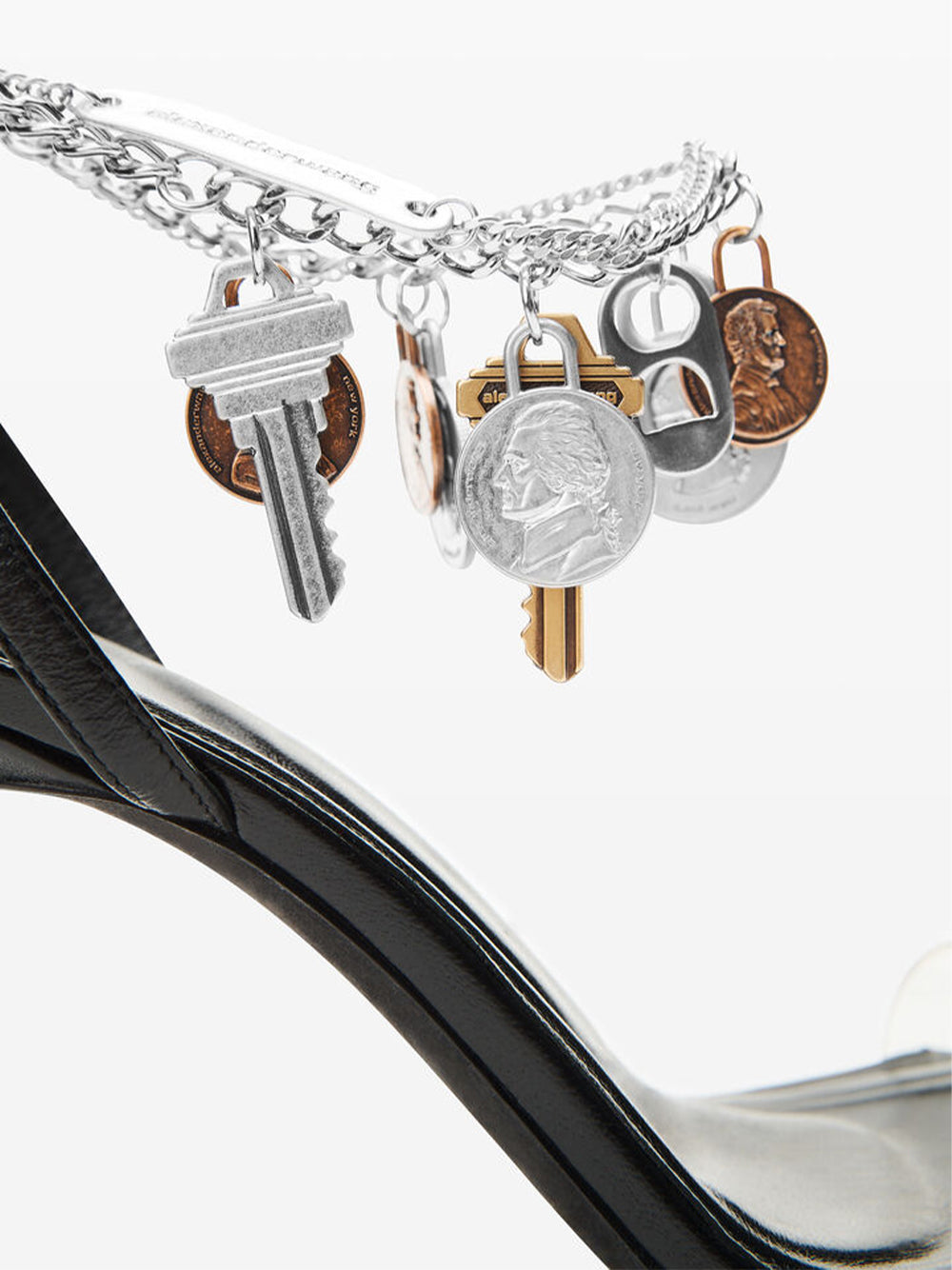 Alexander Wang แบรนด์ของนักออกแบบอัจฉริยะแห่งวงการแฟชั่นชาวอเมริกัน ที่สร้างชื่อให้ตัวเองในวงการก่อนก่อตั้งแบรนด์ของตัวเองเมื่อปี ค.ศ. 2005 รองเท้าแตะส้นสูงแบบสลิงแบ็คสูง 105 มม. ผลิตจากหนังแท้ ตกแต่งสายรัดข้อเท้าแบบโซ่ประดับโลโก้ ผสานดีเทลสายรัดโปร่งใส เสริมความหรูหราด้วยพื้นรองเท้าหนังเรียบเนียน และพื้นรองเท้าด้านนอกจากหนังวัวคุณภาพดี แบรนด์แฟชั่นสตรีทสุดขบถที่ผสมผสานระหว่างภาพลักษณ์ของหญิงสาวที่แข็งแกร่งเข้ากับความไม่สมบูรณ์แบบได้อย่างลงตัวพร้อมจะให้คุณมิกซ์แอนด์แมตช์ครีเอทที่ไม่ซ้ำใครได้ในทุกวัน