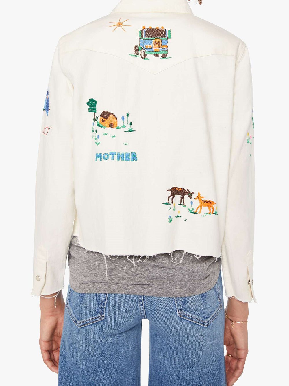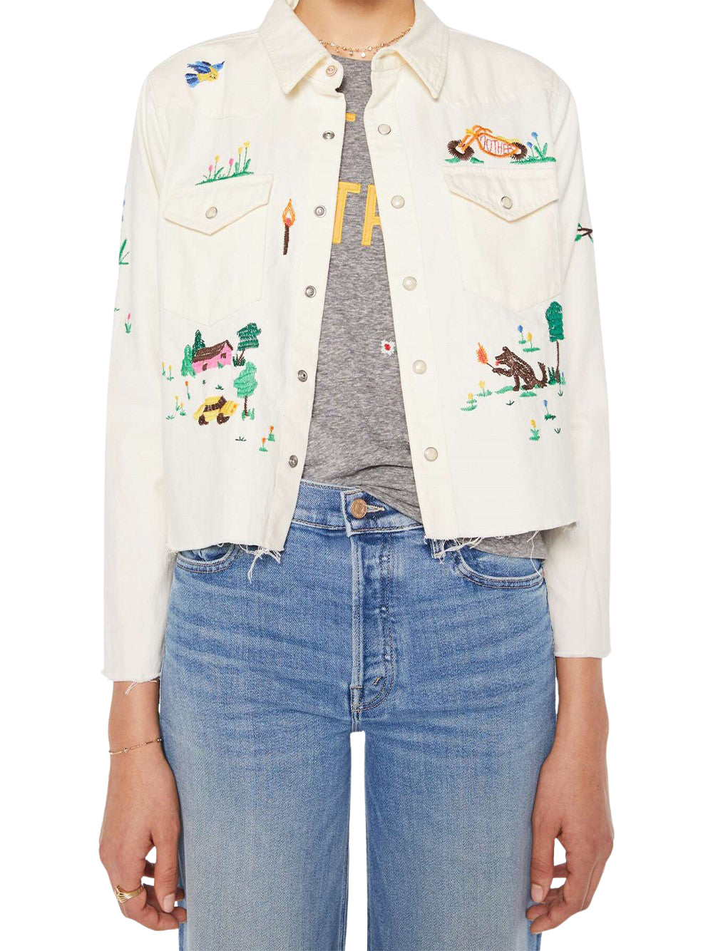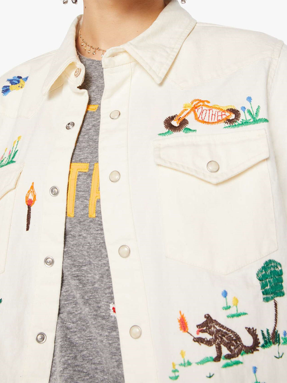 เสื้อแจ็คเก็ตแขนยาวจากแบรนด์ MOTHER เสื้อเชิ้ตเดนิมทรงตะวันตก มาพร้อมกระเป๋าแปะด้านหน้าและชายเสื้อตัดดิบทรงสั้น ผลิตจากผ้าคอตตอน 100% โทนสี Fired Up ขาวนวลประดับลายปักสีสันรอบตัว ตกแต่งด้วยกระดุมสแน็ปด้านหน้า ชิ้นแฟชั่นที่ได้แรงบันดาลใจจากไลฟ์สไตล์สุดรีแล็กซ์ตามแบบฉบับชาวแอลเอ (Los Angeles) สามารถหยิบนำมิกซ์แอนด์แมทช์เข้ากับเสื้อยืด หรือกางเกงขายาวสำหรับลุคแคชชวลในวันสบาย