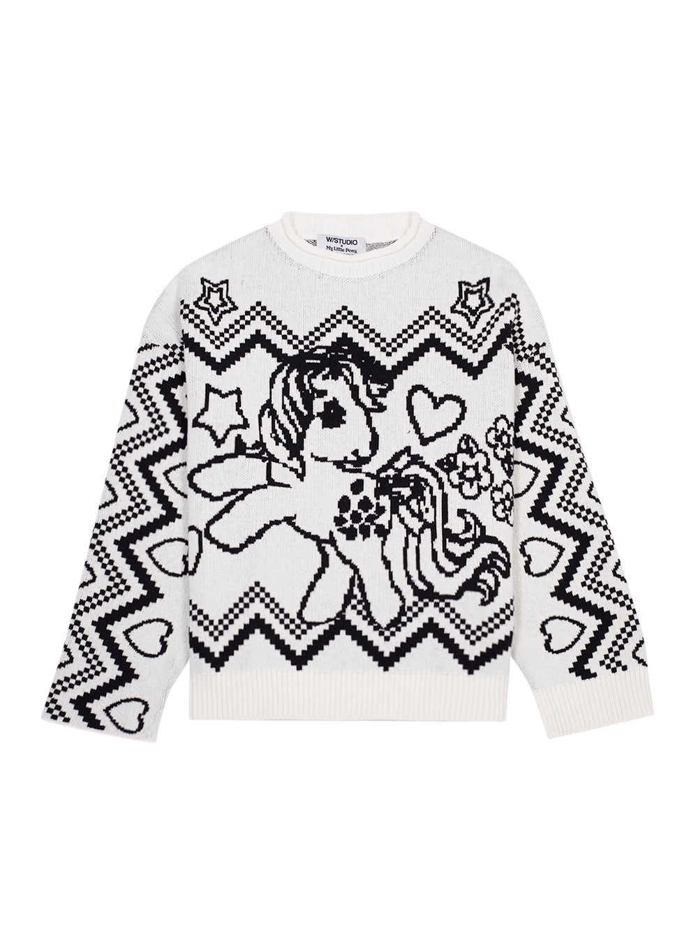 The Pony Love Knit Jumper from Italian fashion brand W STUDIO is a limited-edition piece from the exclusive W/STUDIO x MY LITTLE PONY collaboration, blending unisex design with inspirations drawn from art, contemporary culture, and iconic pop imagery. Crafted from 100% cotton, this oversized knit features bold pony graphics and geometric patterns that create a playful yet refined visual statement. Designed for comfort and individuality, it effortlessly elevates everyday looks with a modern, expressive edge.