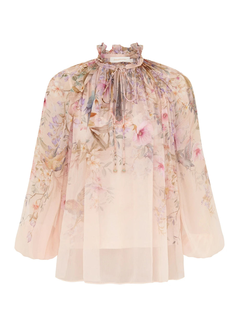 The Rebellion Billow Blouse in Cream Aviary from our Cruise 2026 Collection, Twisted Romance. A long sleeve blouse featuring a V-neckline with stand collar and heavy gathering throughout.