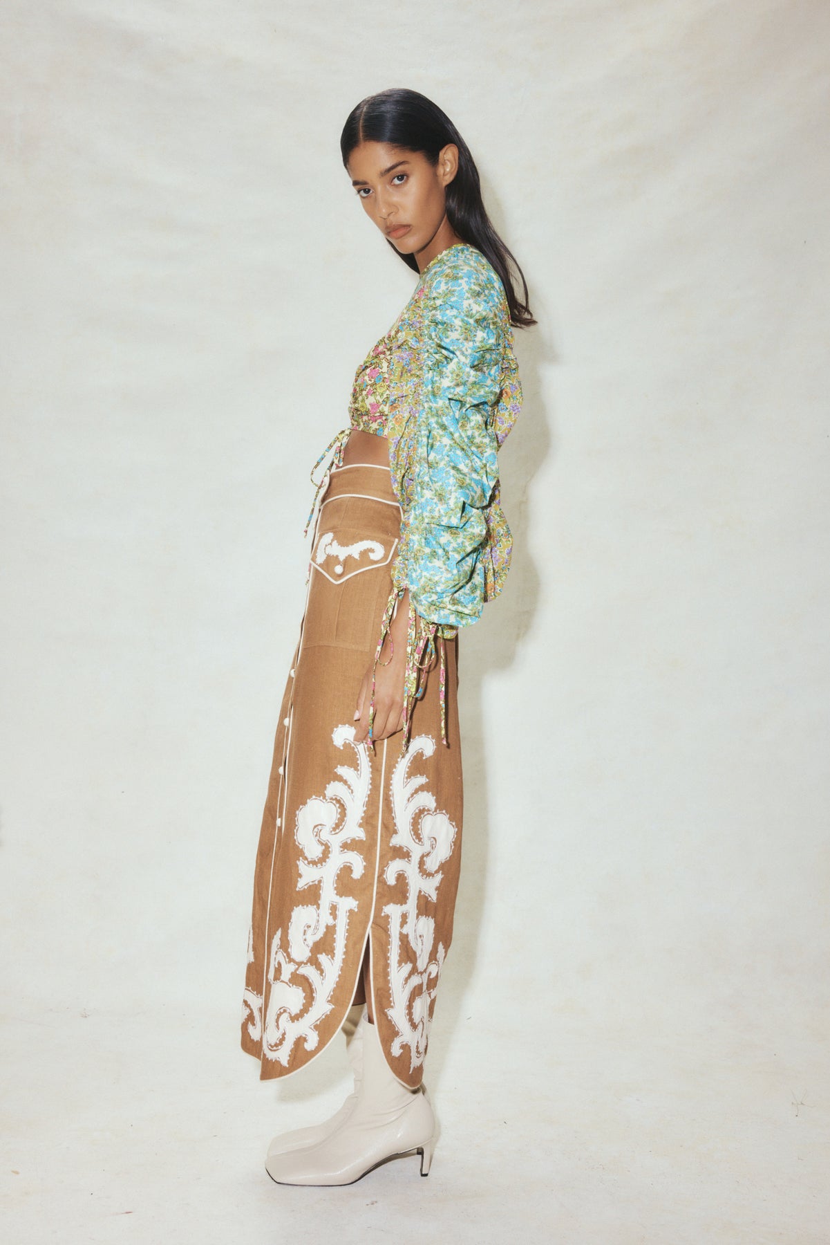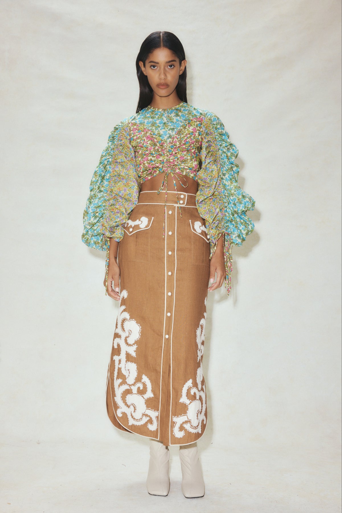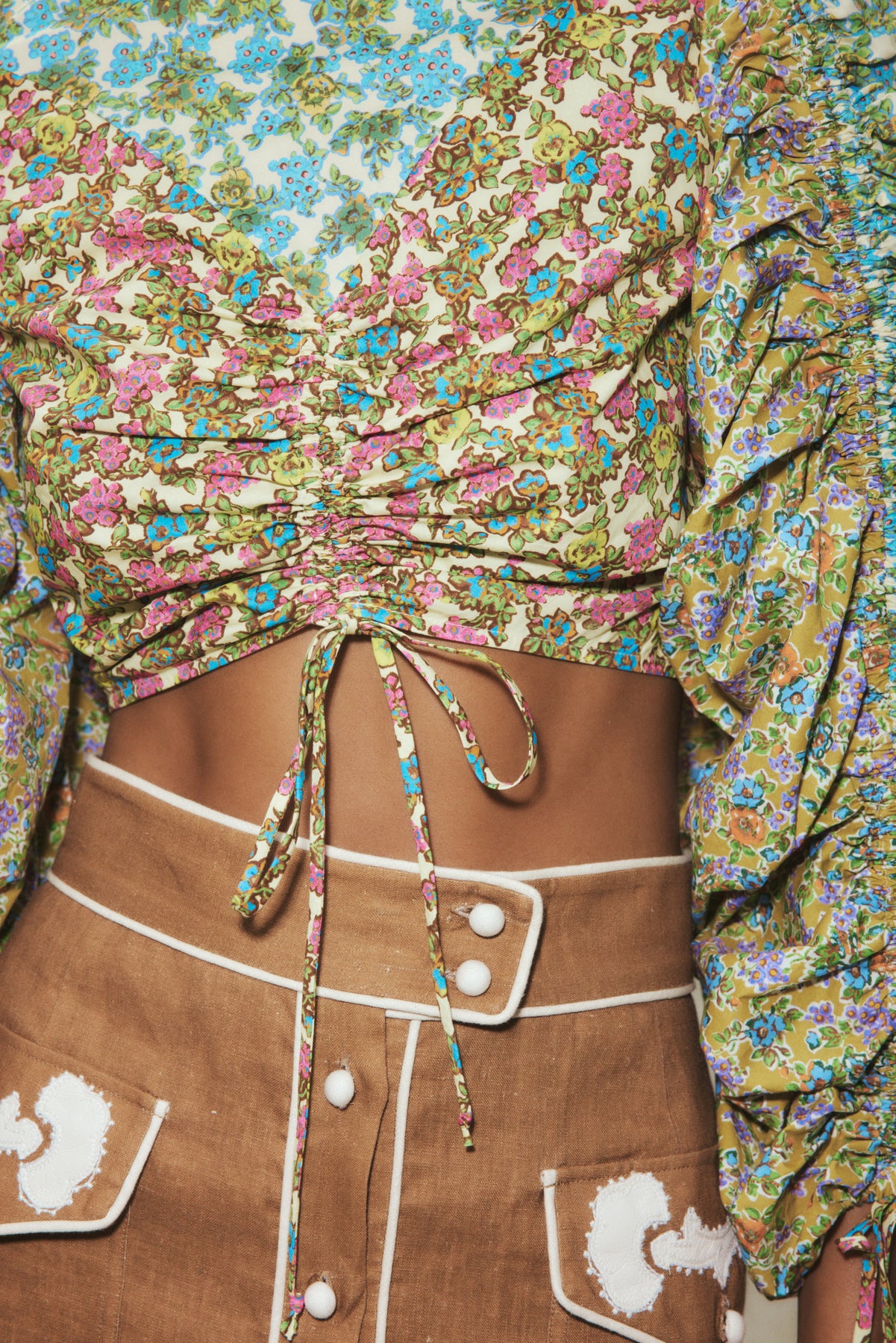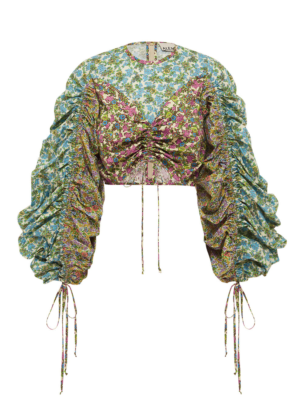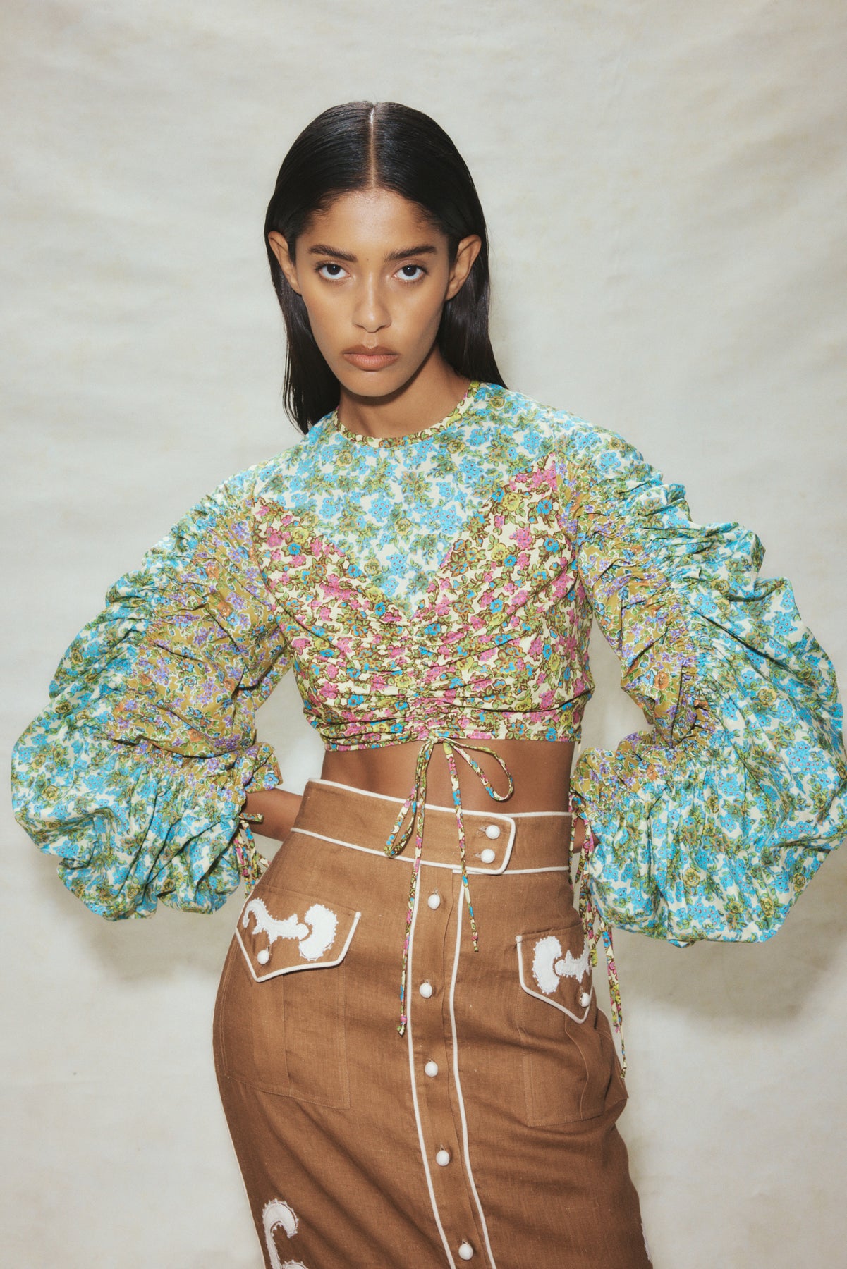 เสื้อครอปสำหรับคุณสุภาพสตรีตัวนี้ ออกแบบให้มีเชือกรูดปรับได้ตรงกลางด้านหน้า โดดเด่นด้วยปลอกแขนบอลลูน ที่มีเชือกรูดปรับระดับได้ มาพร้อมซิปที่ด้านหลังตรงกลาง เพื่อง่ายต่อการสวมใส่
