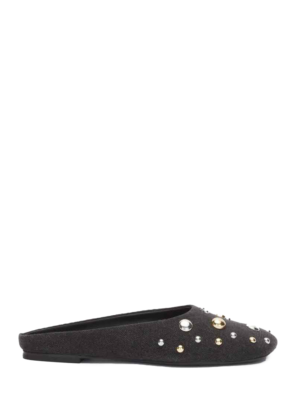An artful take on ease. This iteration of the ID Flat Mule is crafted from soft textile and adorned with mixed metal studs that catch the light from every angle. Maintaining the sleek, sculptural lines of the original, this slip-on style balances minimalist form with a touch of statement shine. Effortlessly transitions from day to night—elevating the everyday with subtle glamour.