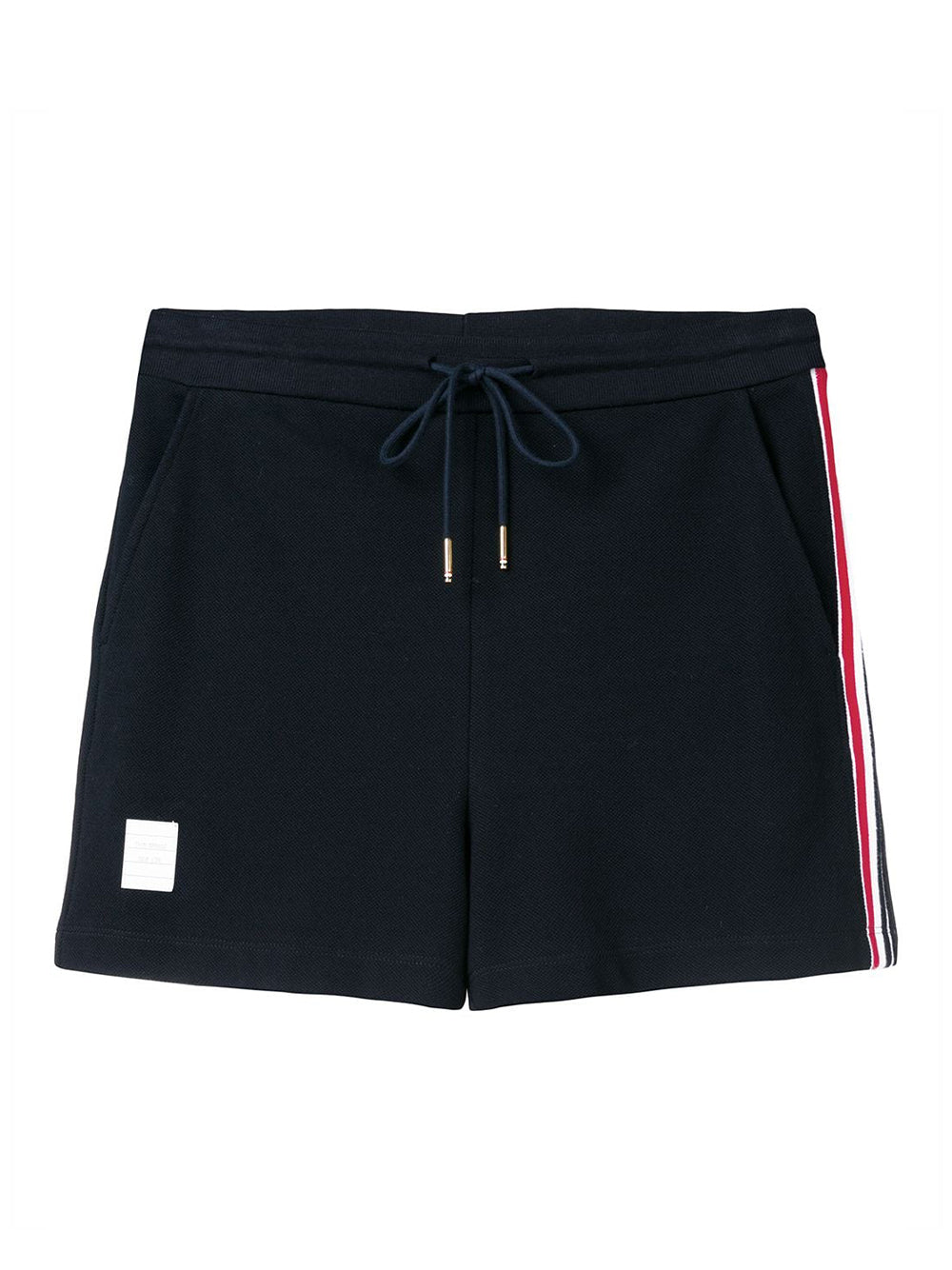 กางเกงขาสั้นสีน้ำเงินกรมท่า ตัดเย็บด้วยผ้าฝ้ายเนื้อนุ่ม ขอบเอวแบบยางยืดมาพ้อมเชือกผูก ดีเทลด้านข้างแต่งแถบสี RWB เอกลักษณ์ Thom Browne