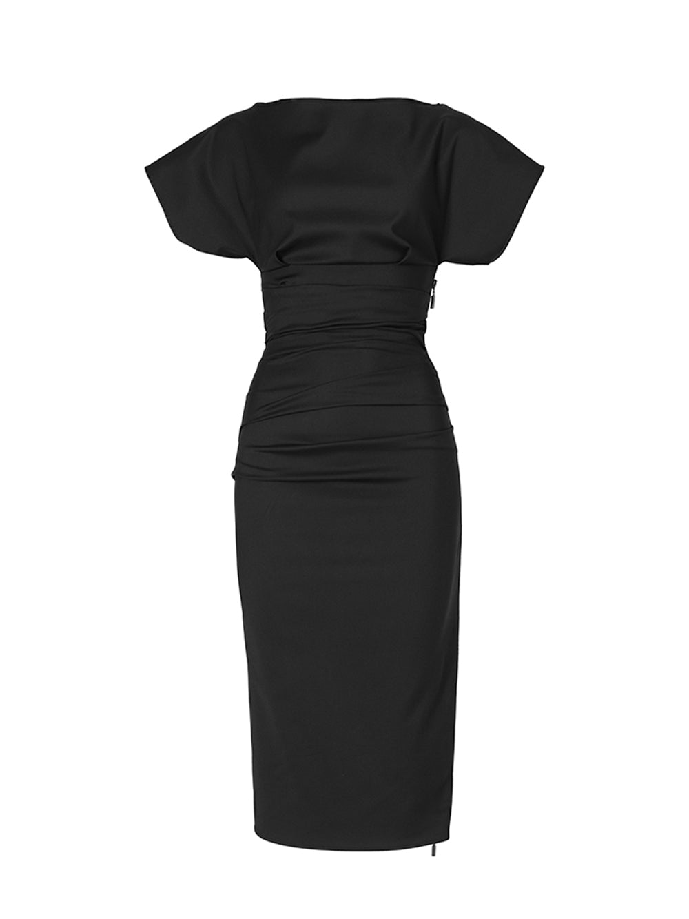เดรสยาวคลุมเข่า รุ่น Yuzu สี Black จับจีบใต้หน้าอก โดดเด่นด้วยดีเทลคัทเอาท์บริเวณหลัง