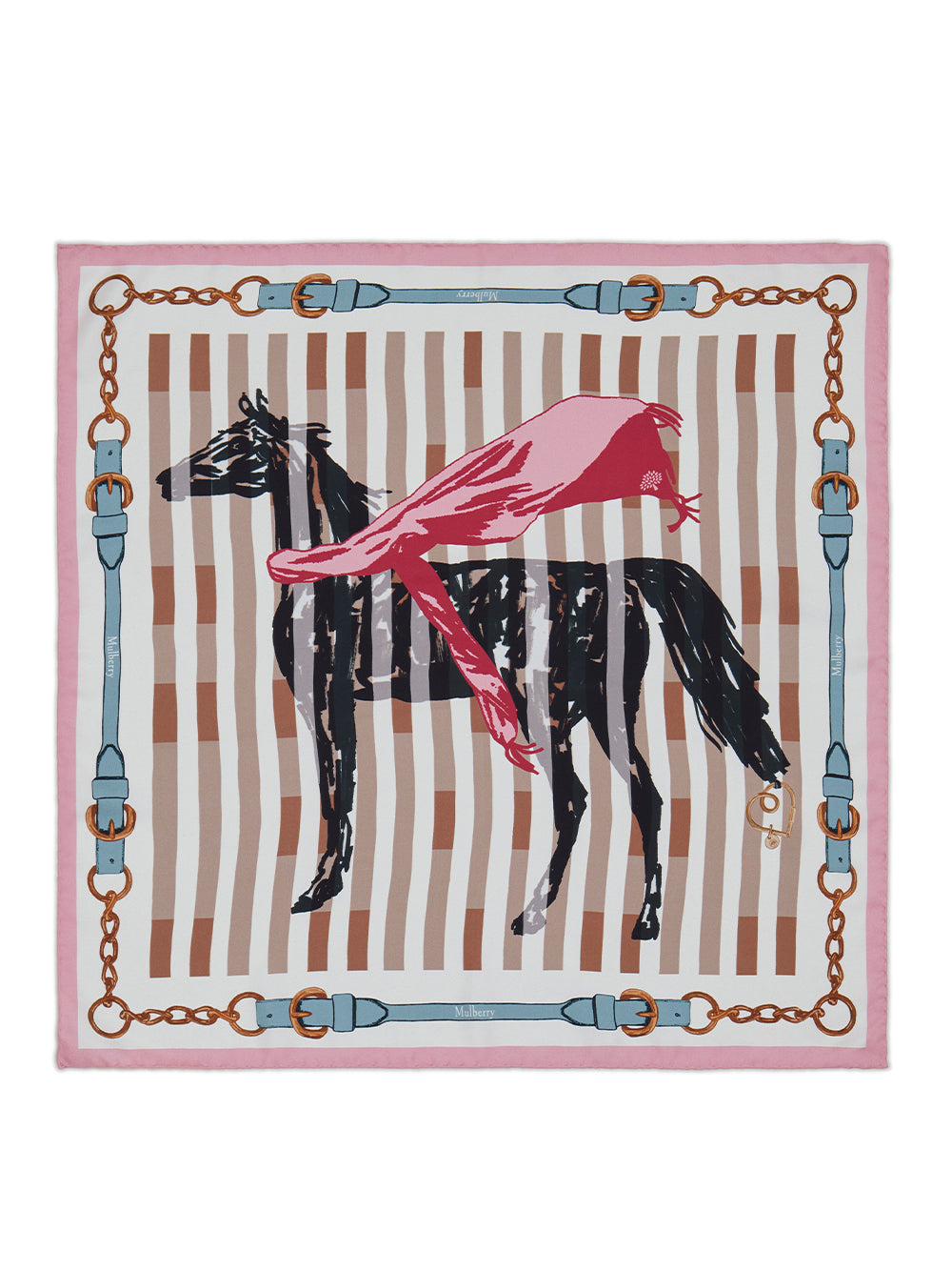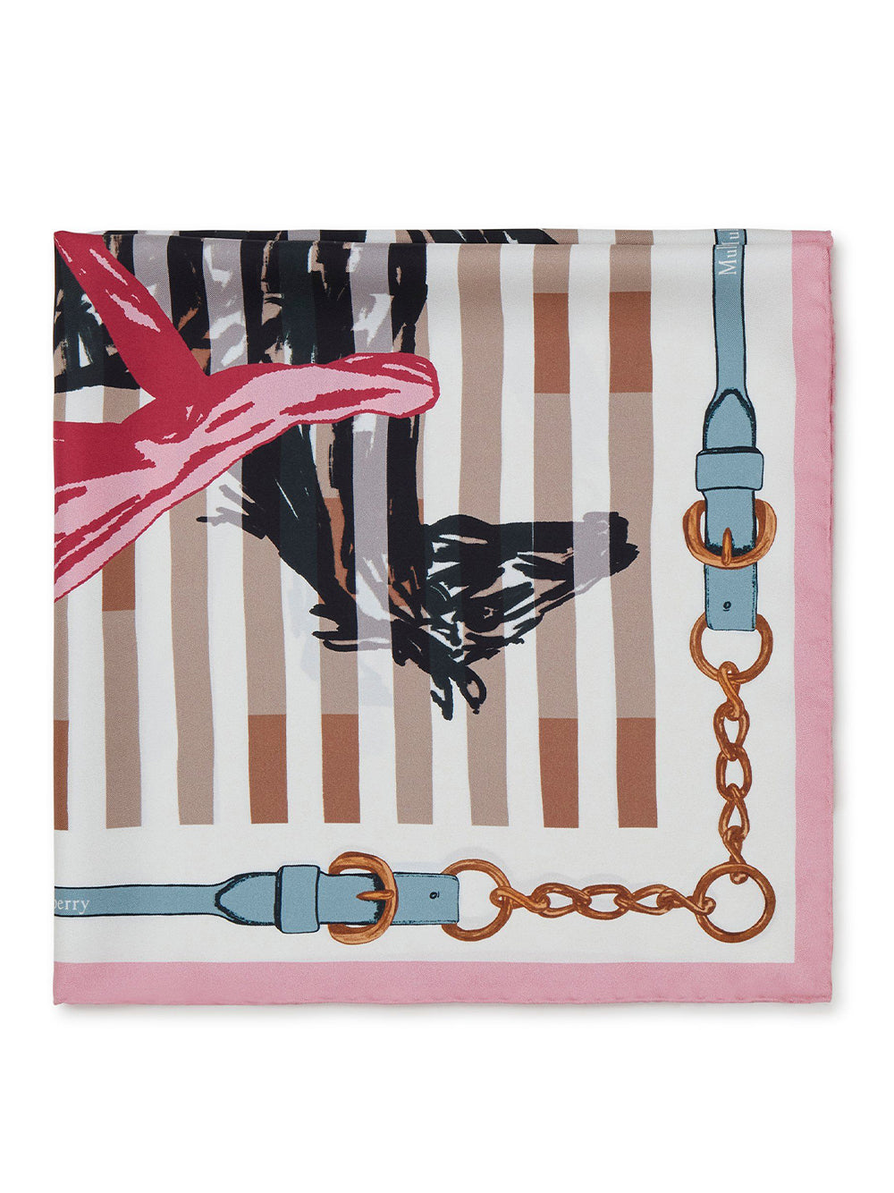 ผ้าพันคอผืนสีเหลี่ยมจากผ้าไหม ตกแต่งด้วยลวดลายอันบอกเล่าเรื่องราวของแบรนด์ Mulberry